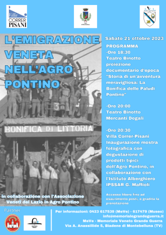 E’ questo l’intento della serata in programma per sabato 21 ottobre a Montebelluna dove sarà presente una delegazione dell’Associazione veneti del Lazio nata con lo scopo di dare memoria a una particolare fase storica, quando tra il 1932 e il 1939 circa 17.000 persone venete colonizzarono l’Agro Pontino e bonificarono i territori paludosi.