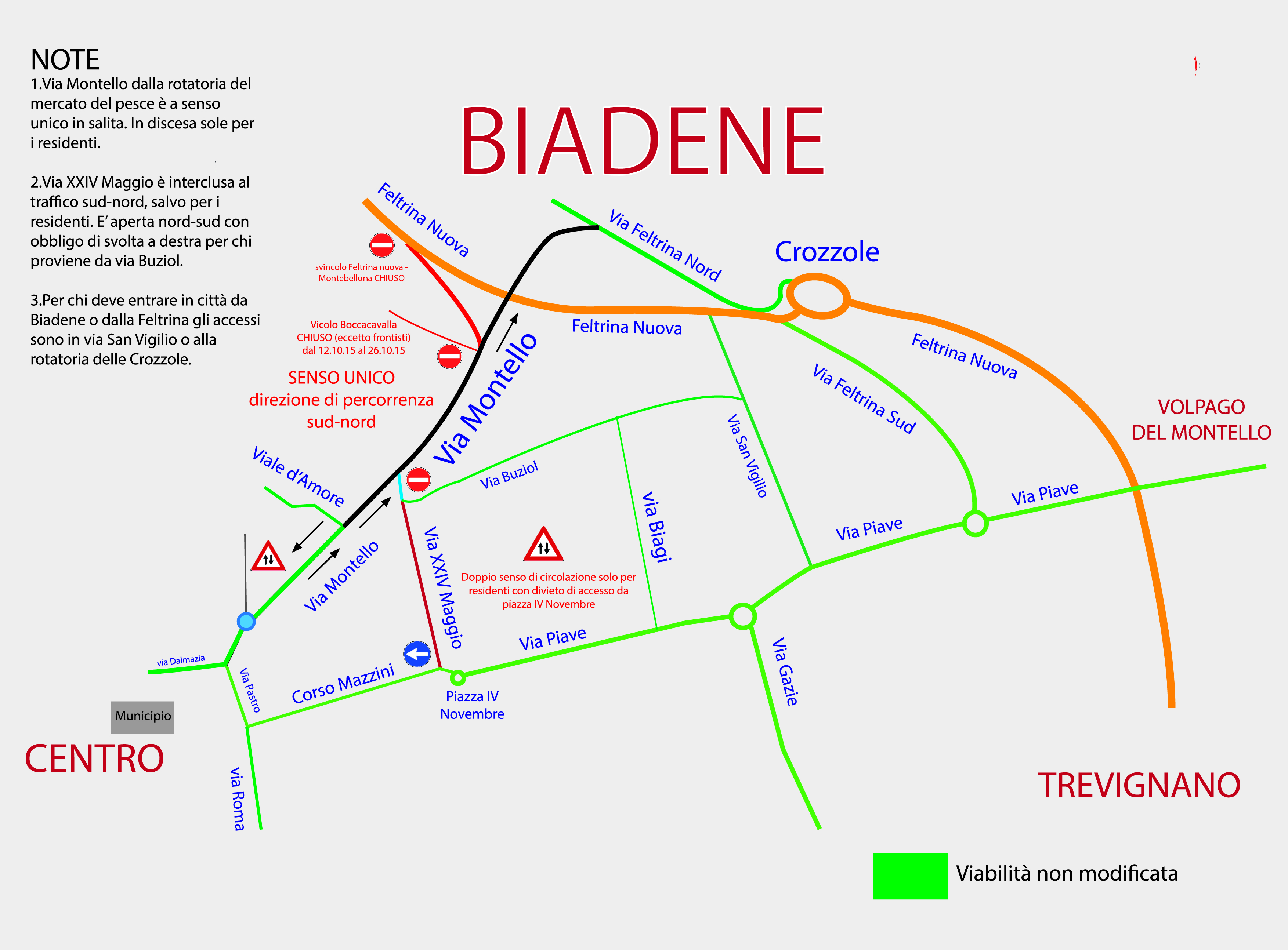 Per quanto riguarda via XXIV Maggio, viene interdetto il traffico da sud a nord e quindi non potrà essere utilizzata come scorciatoia per andare da piazza IV novembre in direzione Biadene. La via viene aperta a doppio senso per i residenti in modo che abbiano la possibilità o di dirigersi ad est verso via Buziol o di scendere con obbligo di svolta a destra su via Mazzini. Via XXIV Maggio è fruibile per chi viene da via Buziol nella direzione nord sud sempre con obbligo di svolta a destra su Corso Mazzini.